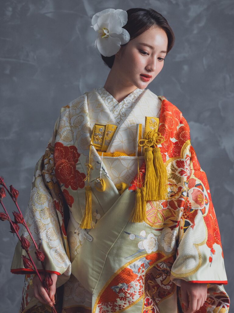 松竹梅という吉祥紋様の代名詞ともいえる柄をアンティークイメージにあしらい、1枚の色打掛の中に大胆に配置した図案の色打掛