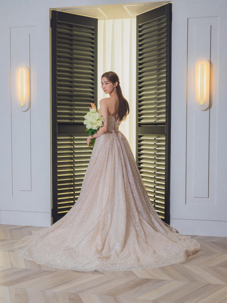 ドレス全体にシャンパンピンクのグリッターが贅沢にあしらわれており、光の当たり方によって様々な輝きを放つ存在感ある1着。可愛さの中にも落ち着いた上品さもあり、胸元のリボンも特徴的なデザインです。