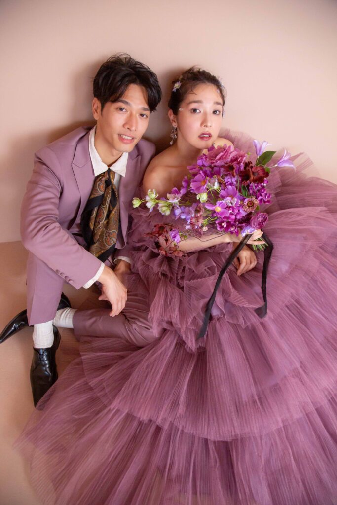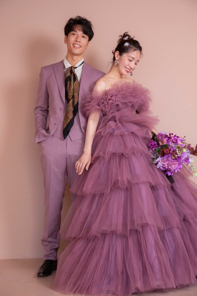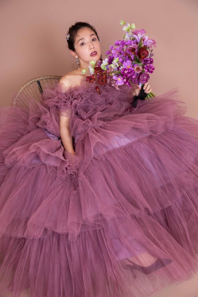 何層にも重なるチュールの繊細なボリューム感と、くすみパープルの色味が可愛らしさと上品さを演出。ティアードのデザインと、ふわふわの袖によってより華やかな1着に。