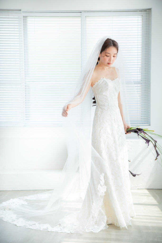 上質なケミカルレースをふんだんに使用したミニマムな1着。あえてトレーンは長くひかず、ケミカルレースの特徴でもある立体感を最大限に活かし、シンプルに仕上げることで高級感をひきたてる1枚に。ボディラインにも注目し、へスタイルやアクセサリーの自由度も増すマーメイドライン。