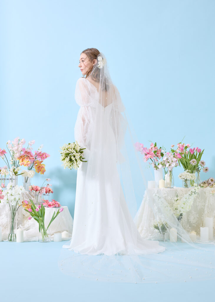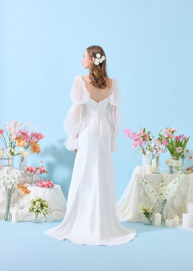 ふんわりとしたキャンディスリーブにパールをあしらった、可憐なデザインのマーメイドドレス。スリーブの付け外しをすることにより、スタイリッシュとキュート、それぞれを表現できる1枚。