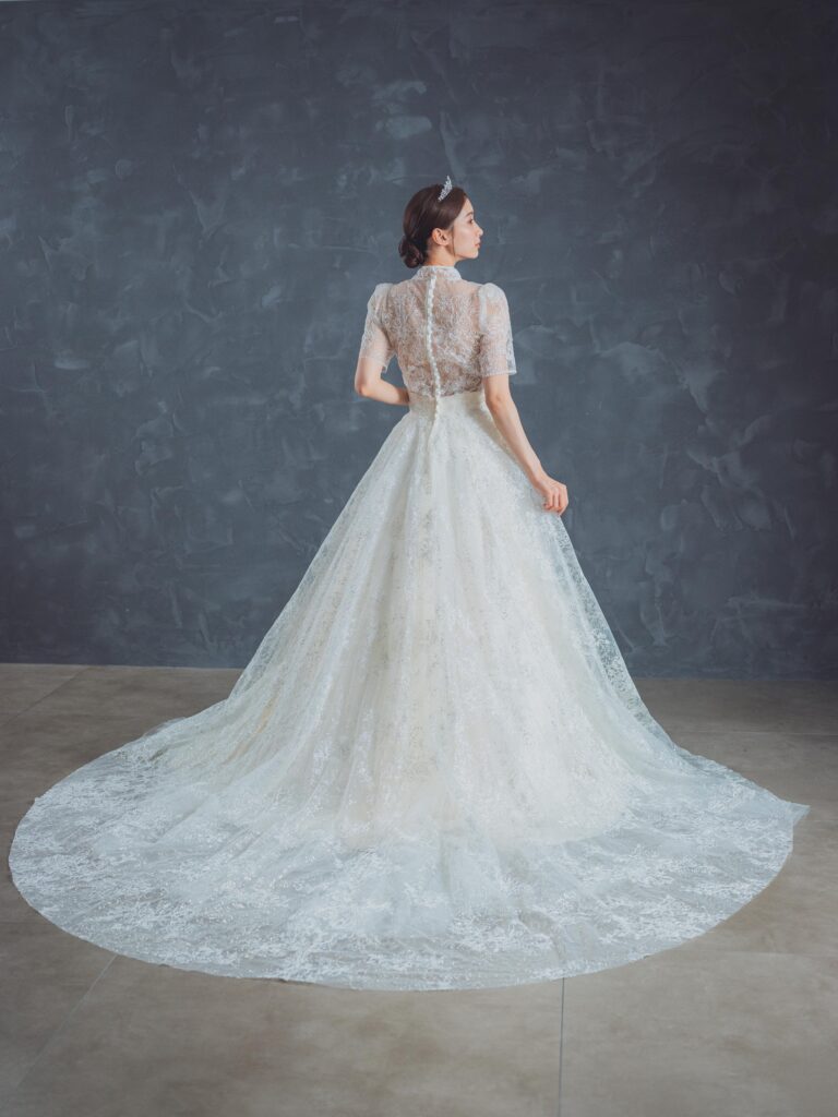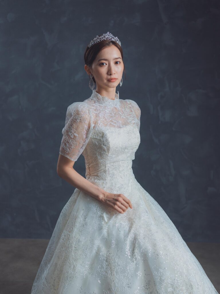 今大人気のサチコツツイとViuexParisのコラボ商品。全身に散りばめられたレースとグリッターが動くたびに華やかさを演出し、360℃どこからみても圧巻のデザイン。首元や二の腕が覆われているデザインが、花嫁の上品さを引き立たせてくれる。
