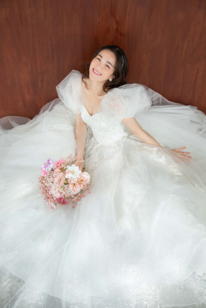 肩のパフスリーブがプリンセス感をより一層ひきたててくれる1着。