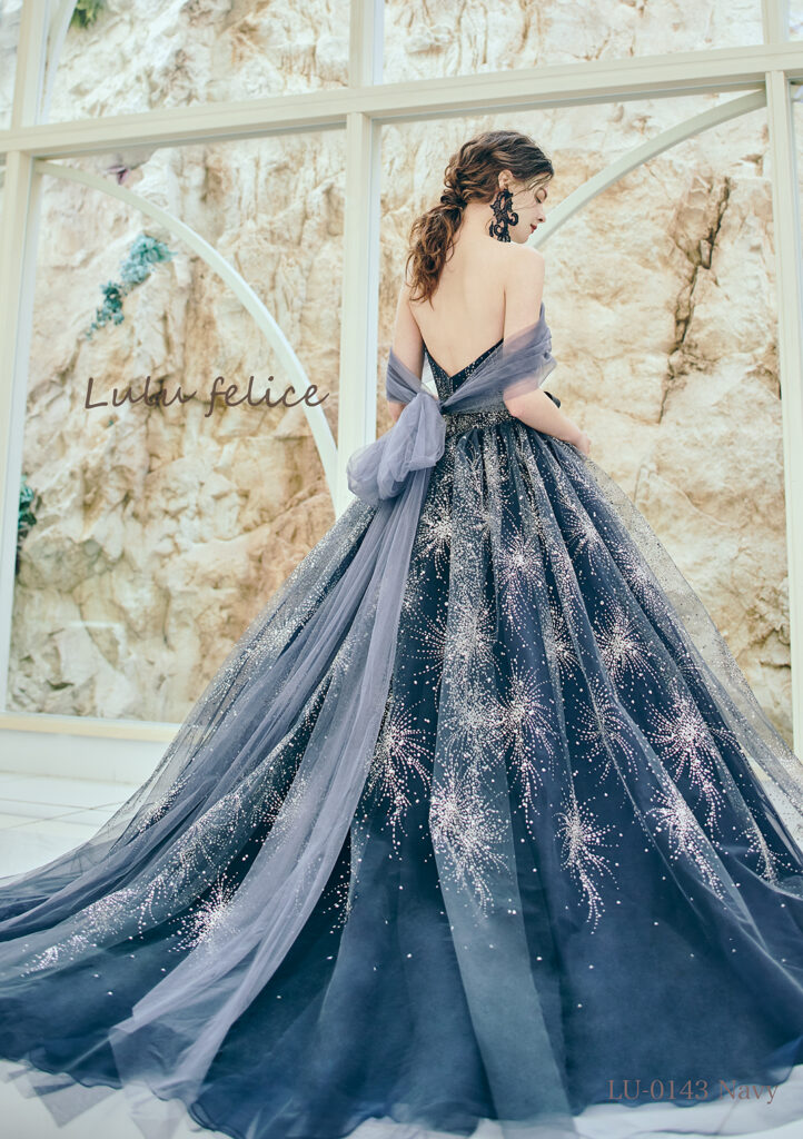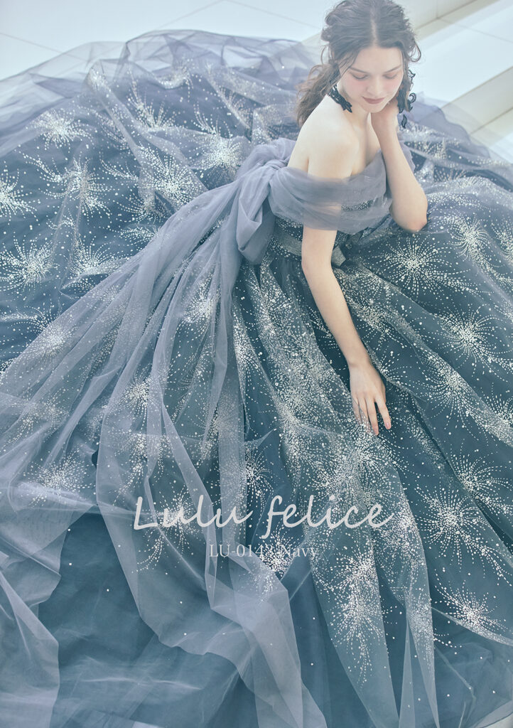繊細なカラーリングによる透明感ある色合いと、一粒一粒こだわったグリッターの輝きが華やかな印象に。透け感のあるオフショルダーでまた違う印象も演出。