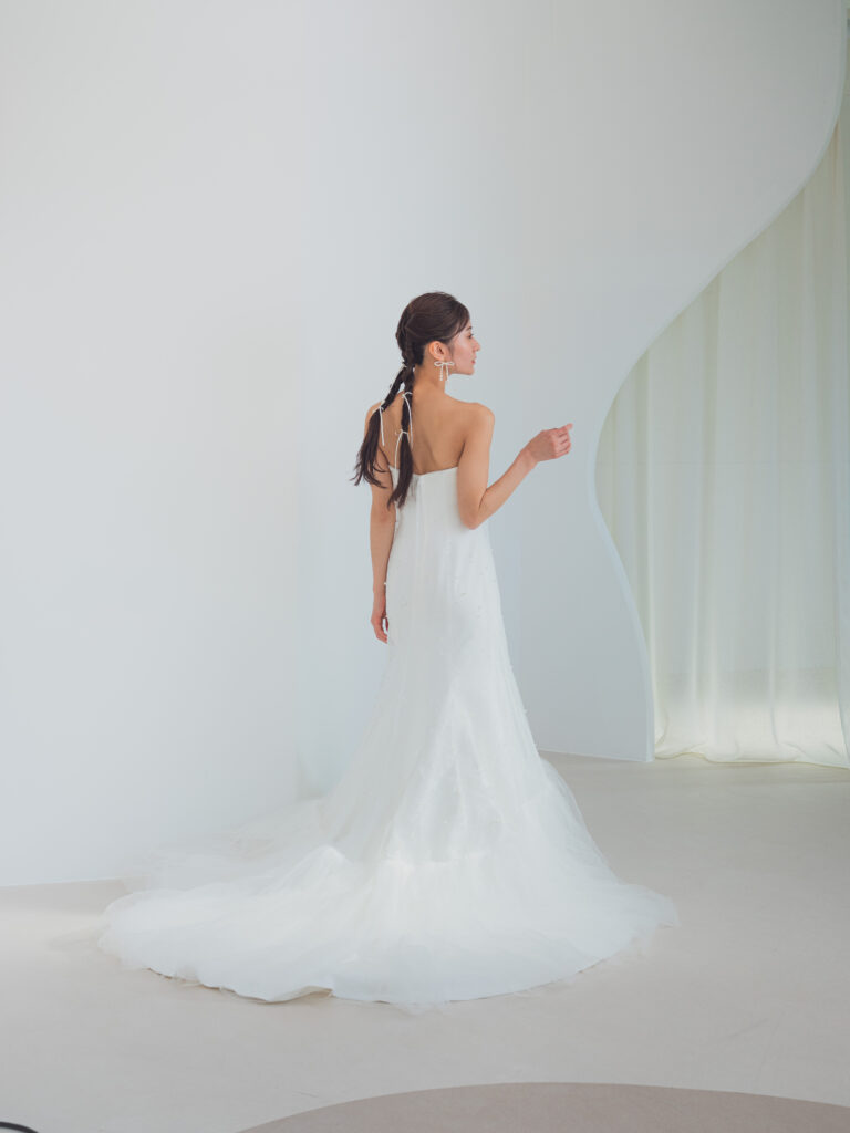 トレンドでもあるパールを全体に使用することで、上品かつ繊細さを演出し、会場に華を添える1着。オーバースカートをはずせば、シンプルでスタイリッシュなマーメイドラインへ。パールのオーバースカートを使用すれば、マーメイドラインとIラインを同時で楽しめるドレス。