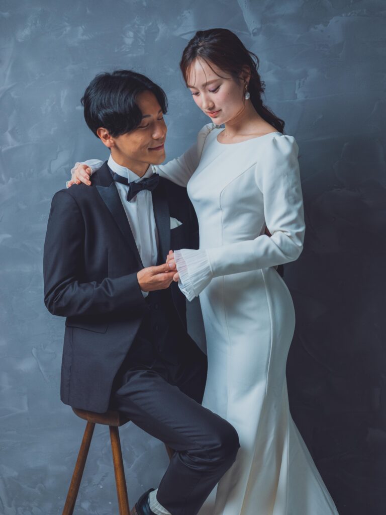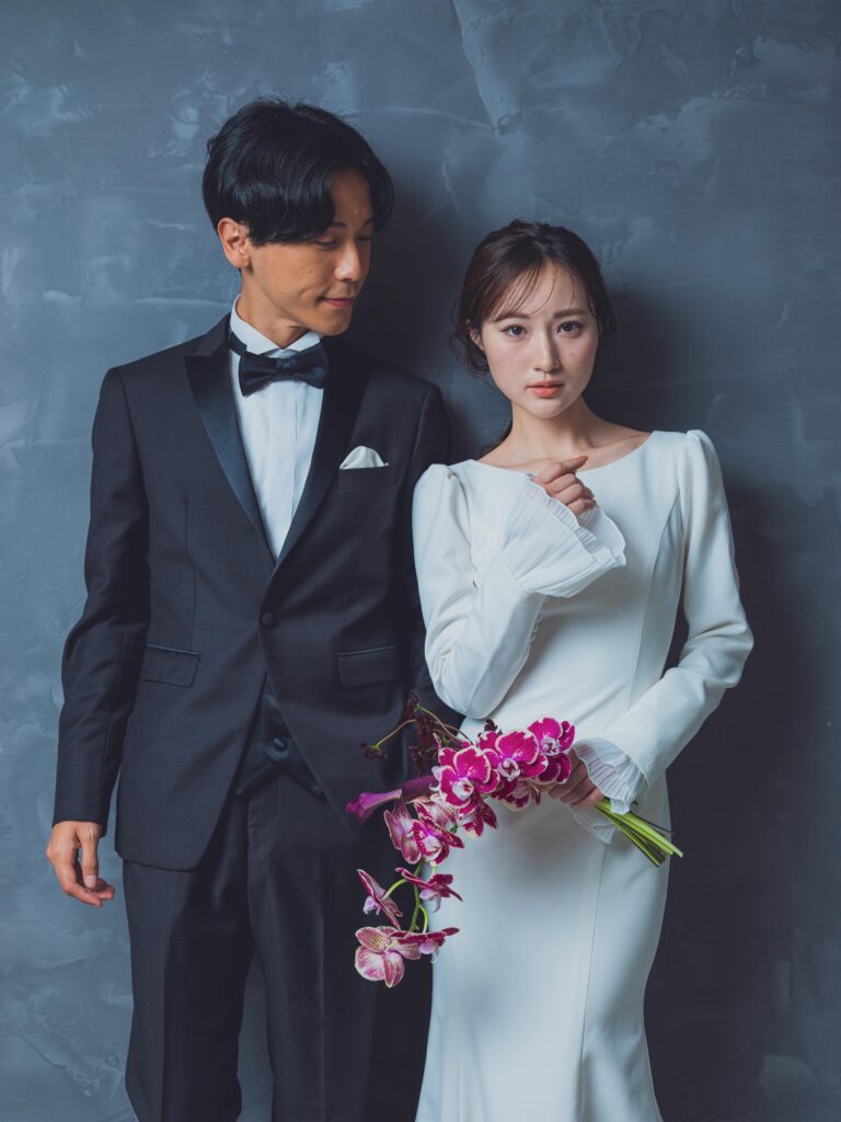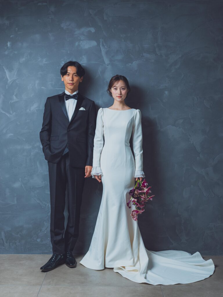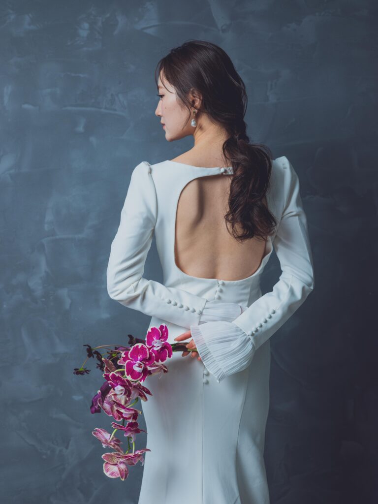 大胆ながらも、計算された開き具合で、花嫁の美しさを最大に惹きだすバックコンシャスなドレス。フロントは、あえて鎖骨のラインに沿った空き具合にデザインし、フロントとバックのバランスをとった、インポートライクな1着。袖口は指先を美しく魅せるバランスの長さを追求したプリーツ加工の素材が特徴的。