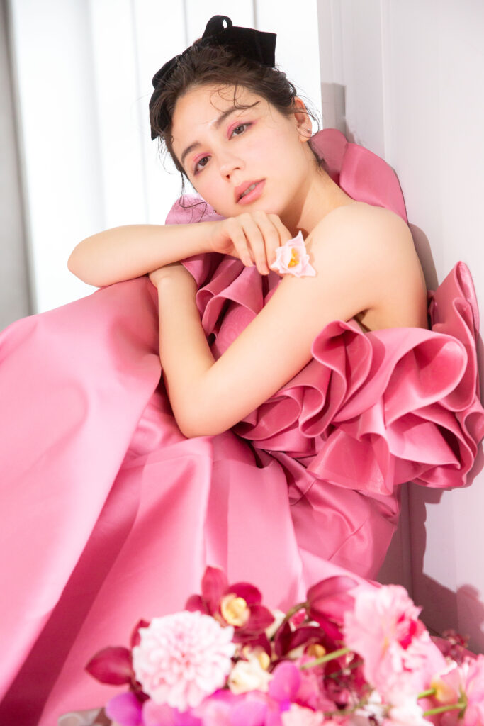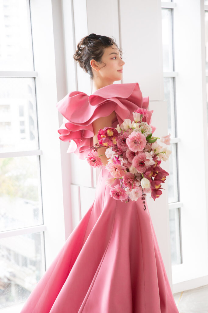 鮮やかなピンクカラーで華やかさとフェミニンさを強調するカラードレス。マーメイドラインに近いデザインでウエストから裾にかけて美しく広がるスカートに、立体感のある大振りなフリルのワンショルダーがより華やかさをプラス。